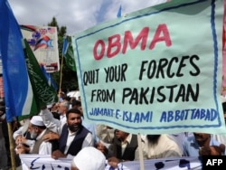"Jamaat-e-Islami" dinçi syýasy partiýasynyň aktiwistleri ABŞ-a garşy şygarlary gygyryp, protest geçirýärler, Abbottabat, 2011-nji ýylyň 6-nji maýy.