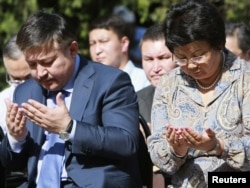 Prezident Roza Otunbaýewa (sagda) we parlamentiň başlygy Ahmatbek Keldibekow Oşdaky hatyra çäresinde, 10-njy iýun.