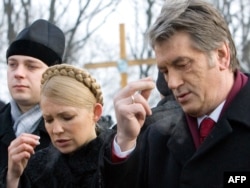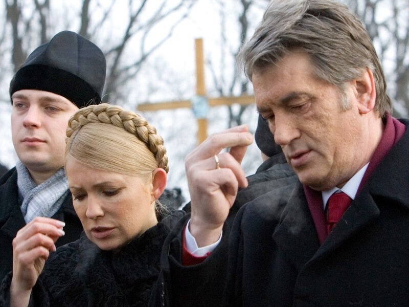 Ukrainanyň ozalky prezidenti Wiktor Ýuşenko (sagda) ýurduň öňki premýer-ministri Ýuliýa Timoşenko Kiýewde, 2010-njy ýylyň 29-njy ýanwary.
