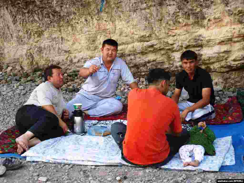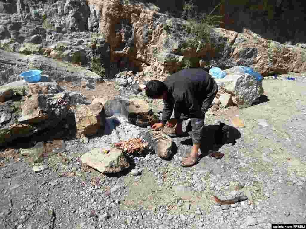 Köçäniň boýunda dag ösümliklerini satyp oturan ýerli adamlar