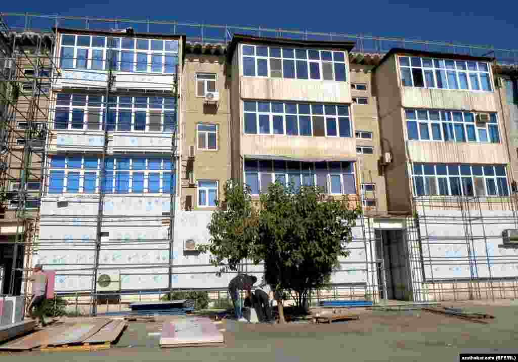 Aşgabadyň Olimpiýa şäherjiginiň gabat garşysyndaky Parahat-1 we Parahat-2 mikroraýonlaryndaky 4-5 gatly jaýlaryň ýüzünden split kondisionerleri aýrylyp, tamlaryň daşy mermere çalym edýän, ak reňkli alfogon materialy bilen örtülýar.