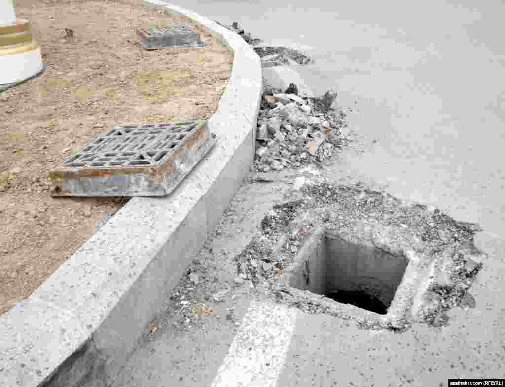 Oguzhan köçesi bilen "Ýubileýnaýa" köçesiniň çatrygynda gazylan lagym turbasyndan çykan beton bölekleri.