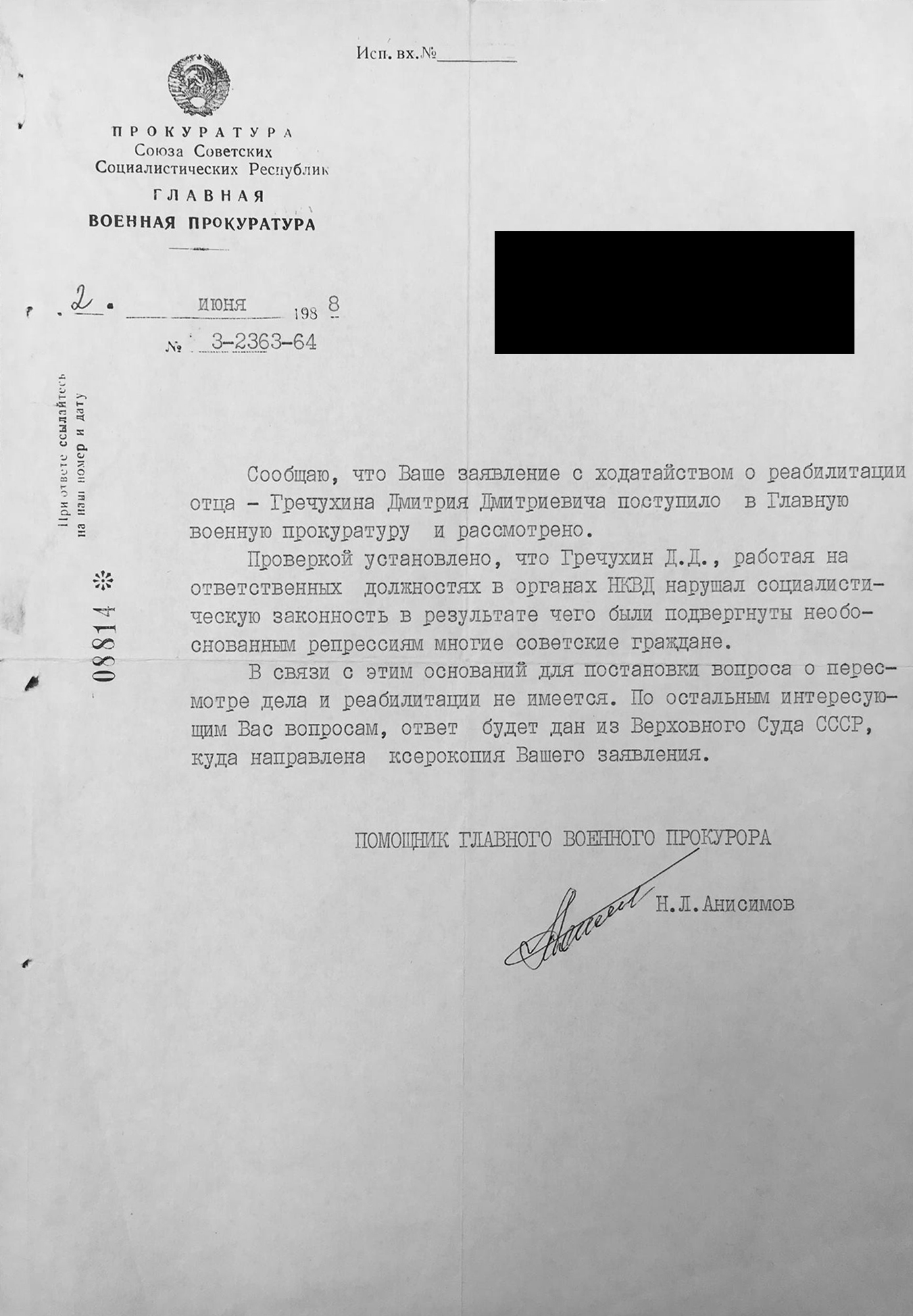 Iberilen jogap hatynda oňa köp maglumat berilmän diňe Dmitriý Greçuhine NKWD diýip atlandyrylýan edaranyň gizlin polisiýa işleýärkä “sosialistik kanunylygy bozanlygy” üçin 1939-njy ýylyň fewralynda ölüm jezasynyň berlendigi aýdylýar.