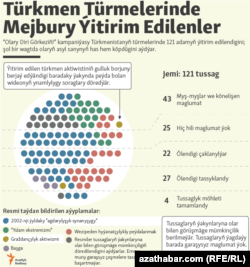 Adam hukuklaryny goraýjylar Türkmenistanda syýasy sebäplere görä tussag edilenleriň günä geçişlerde köplenç goýberilmeýändigini aýdýarlar. Halkara guramalarynyň türkmen türmelerinde dereksiz ýiten tussaglaryň ýöredýän sanawlarynyň düzümi gitdigiçe artýar.