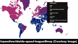 Cable.co.uk neşiriniň maglumatyna görä, 2021-nji ýylyň Global tizlik tablisasynda Türkmenistan internet tizligi boýunça dünýäniň synag geçirilen ýurtlarynyň arasynda iň yzdaky hatarlaryň birini eýeleýär.